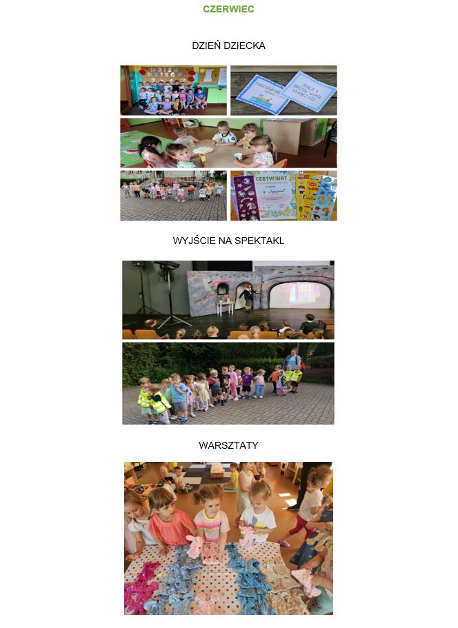 Dzieci z okazji Dnia Dziecka oglądały przedstawienie kukiełkowe pt.: O co temu Panu chodzi - teatr lalek Ciastuś. Następnie w ogrodzie odbyły się zawody w 5 konkurencjach. Wszystkie dzieci otrzymały medale za dobrą zabawę.